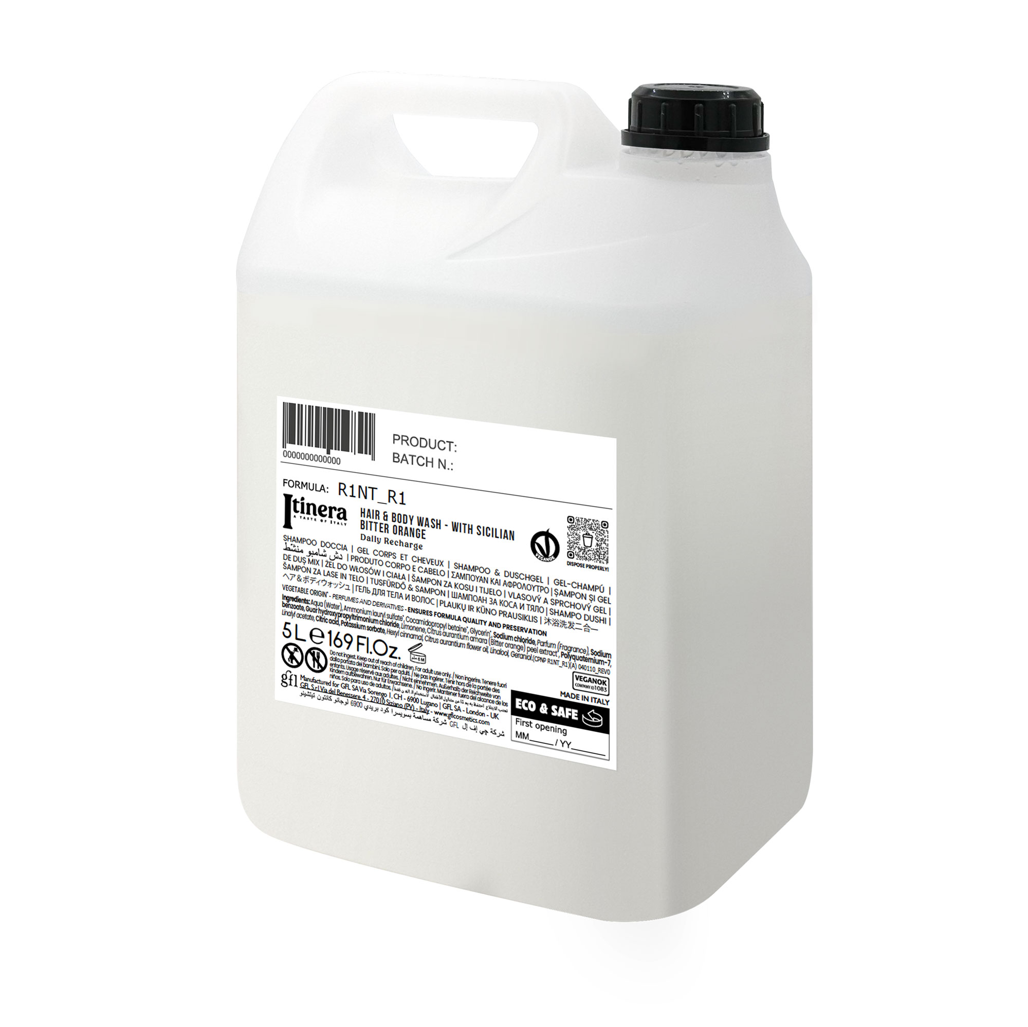 sampon si gel de dus Itinera – 5 litri, cu extract natural de portocala amara siciliana, formulat din 95% ingrediente de origine naturala. Produsul 2 in 1 ofera o curatare delicata si revigoranta pentru piele si par, aducand un plus de energie si prospetime zilnica.